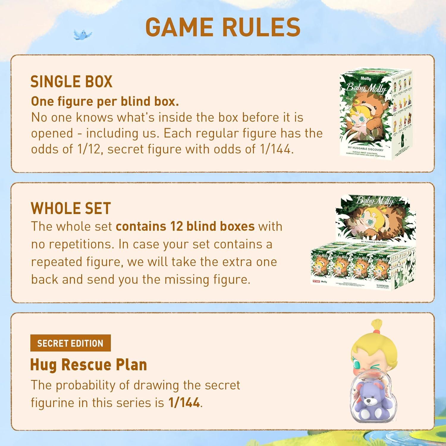 POP MART Baby Molly My Huggable Discovery Series Figures: The blind box contains a random figure from a specific series. Each blind box only contains one figure. No one, including us, knows what's inside. This collection contains 12 blind box figures, one of them might be the secret edition.