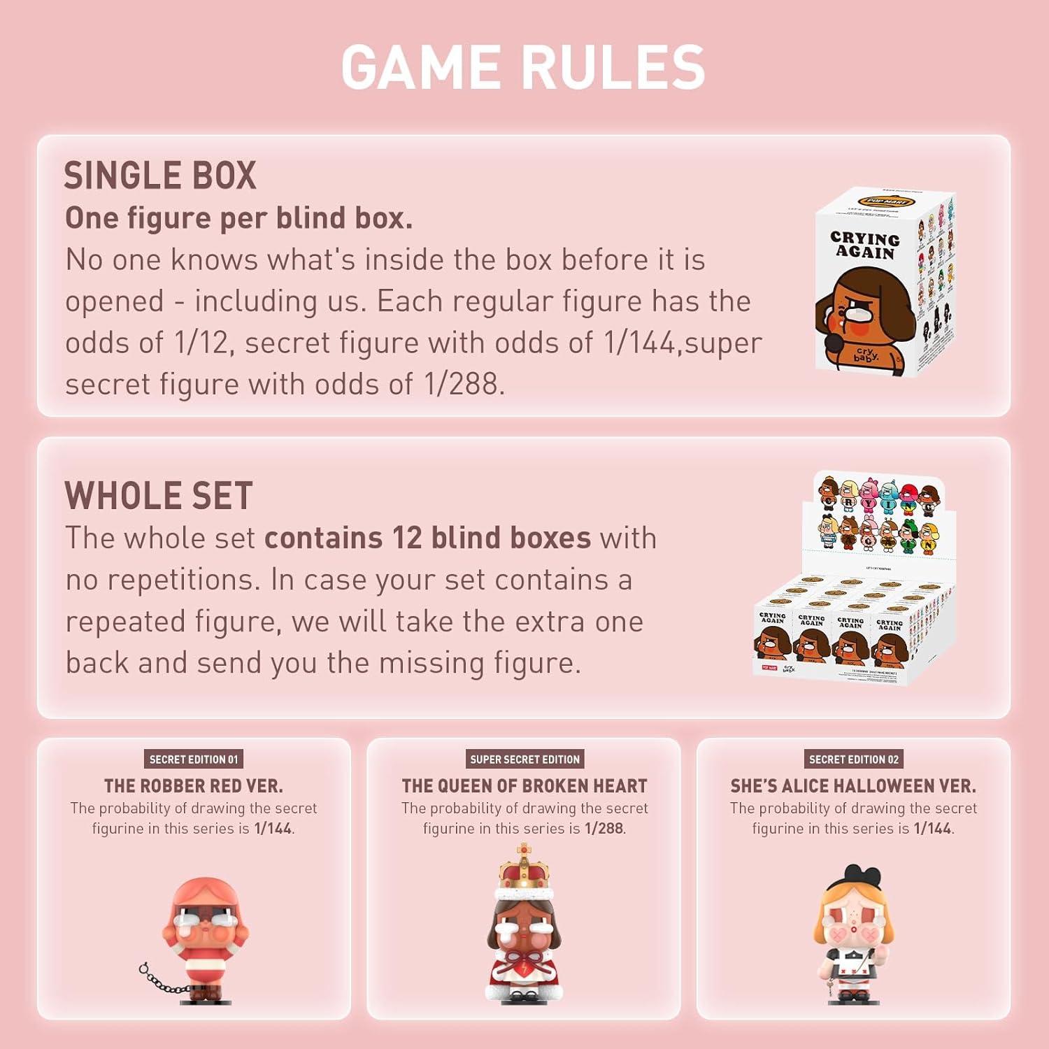 POP MART CRYBABY Crying Again Series Figures: The blind box contains a random figure from a specific series. Each blind box only contains one figure. No one, including us, knows what's inside. This collection contains 12 blind box figures, one of them might be the secret edition.
