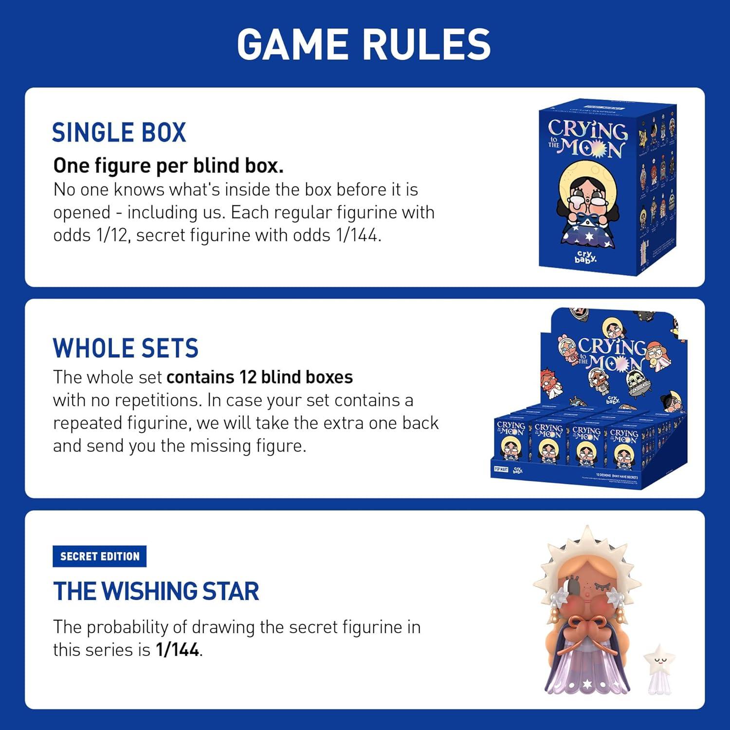 POP MART CRYBABY CRYING TO THE MOON SERIES FIGURES: The blind box contains a random figure from a specific series. Each blind box only contains one figure. No one, including us, knows what's inside. This collection contains 12 blind box figures, one of them might be the secret edition.