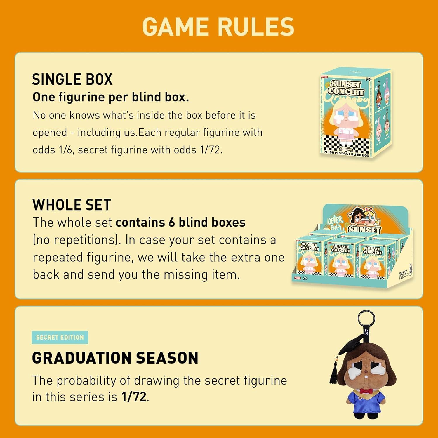 POP MART CRYBABY Sunset Concert Series-Plush Pendant Blind Box: The blind box contains a random figure from a specific series. Each blind box only contains one figure. No one, including us, knows what's inside. This collection contains 6 blind box figures, one of them might be the secret edition.