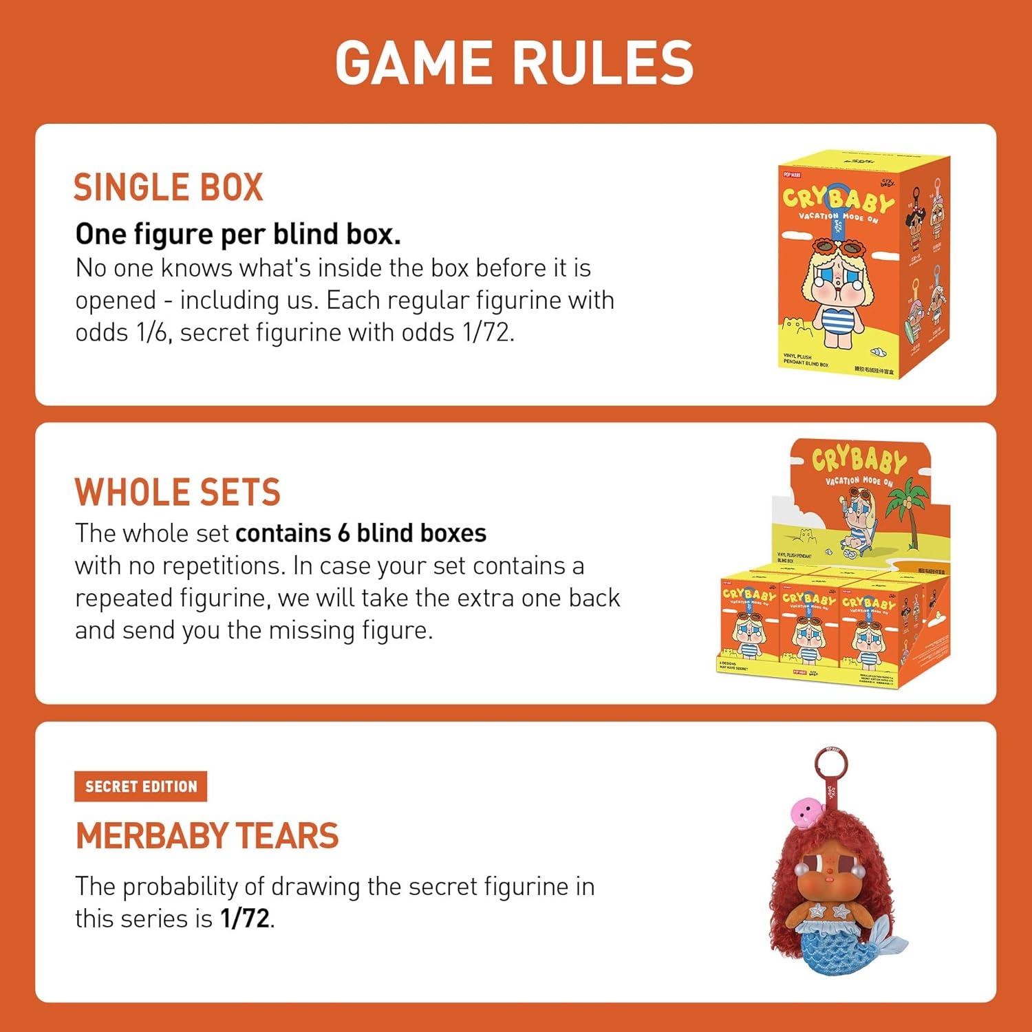 POP MART CRYBABY Vacation Mode On Series-Vinyl Plush Pendant Blind Box: The blind box contains a random figure from a specific series. Each blind box only contains one figure. No one, including us, knows what's inside. This collection contains 6 blind box figures, one of them might be the secret edition.