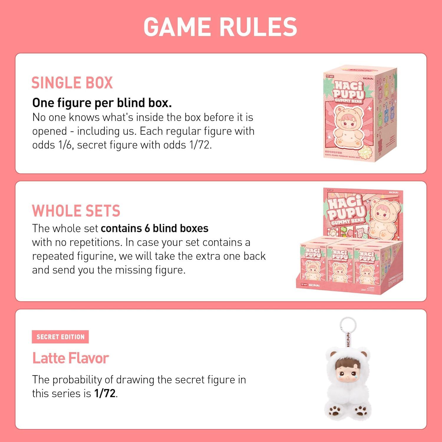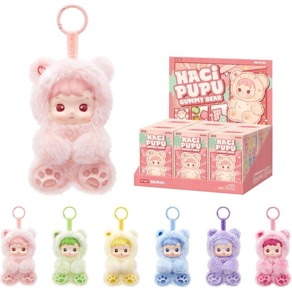 POP MART HACIPUPU Gummy Bear Series-Vinyl Plush Pendant Blind Box: The blind box contains a random figure from a specific series. Each blind box only contains one figure. No one, including us, knows what's inside. This collection contains 6 blind box figures, one of them might be the secret edition.