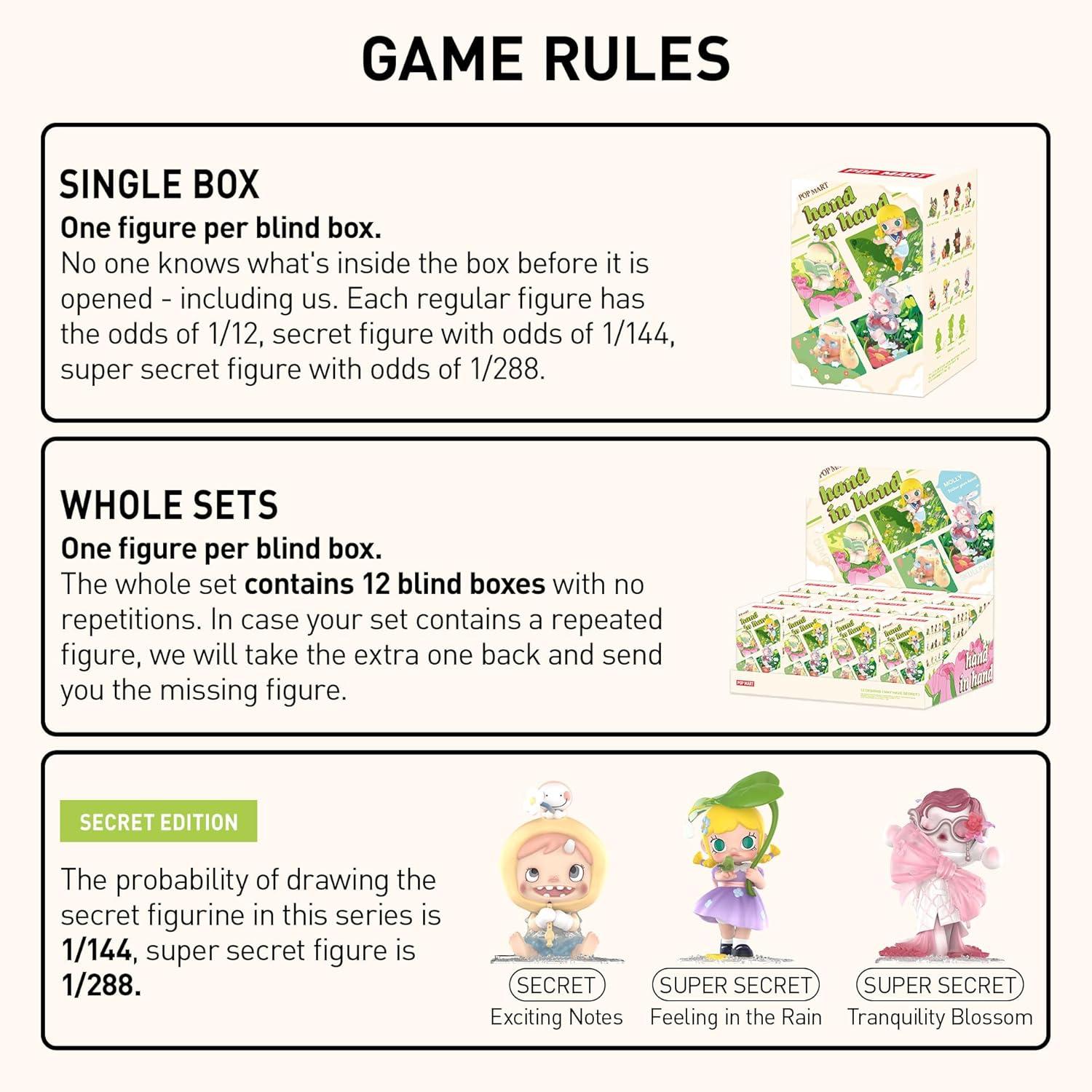 POP MART Hand in Hand Series Figures: The blind box contains a random figure from a specific series. Each blind box only contains one figure. No one, including us, knows what's inside. This collection contains 12 blind box figures, one of them might be the secret edition.