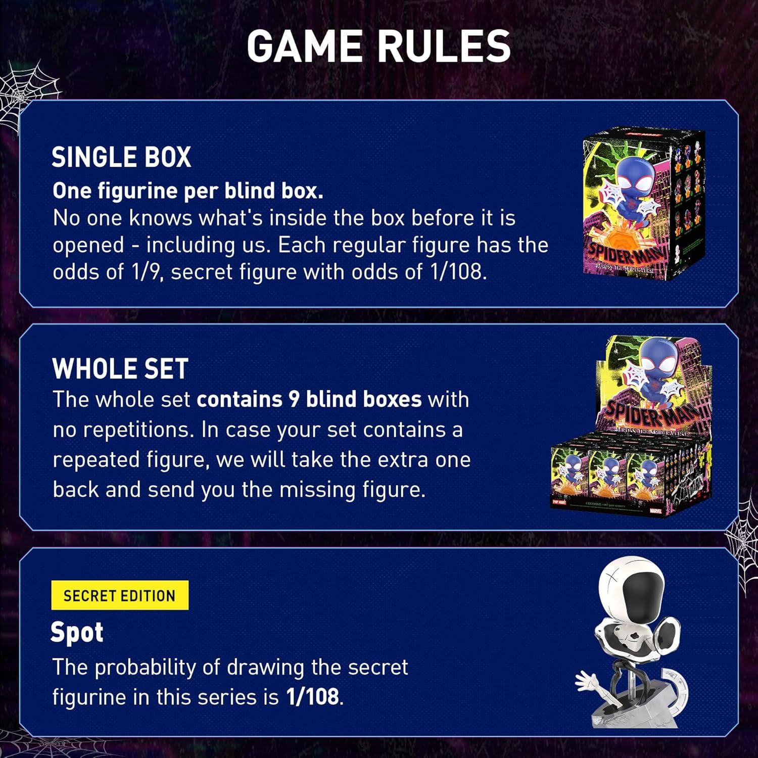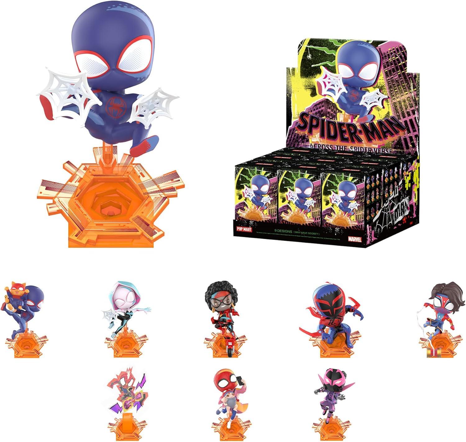 POP MART Marvel Spider-Man Across the Spider-Verse Series Figures: The blind box contains a random figure from a specific series. Each blind box only contains one figure. No one, including us, knows what's inside. This collection contains 9 blind box figures, one of them might be the secret edition.