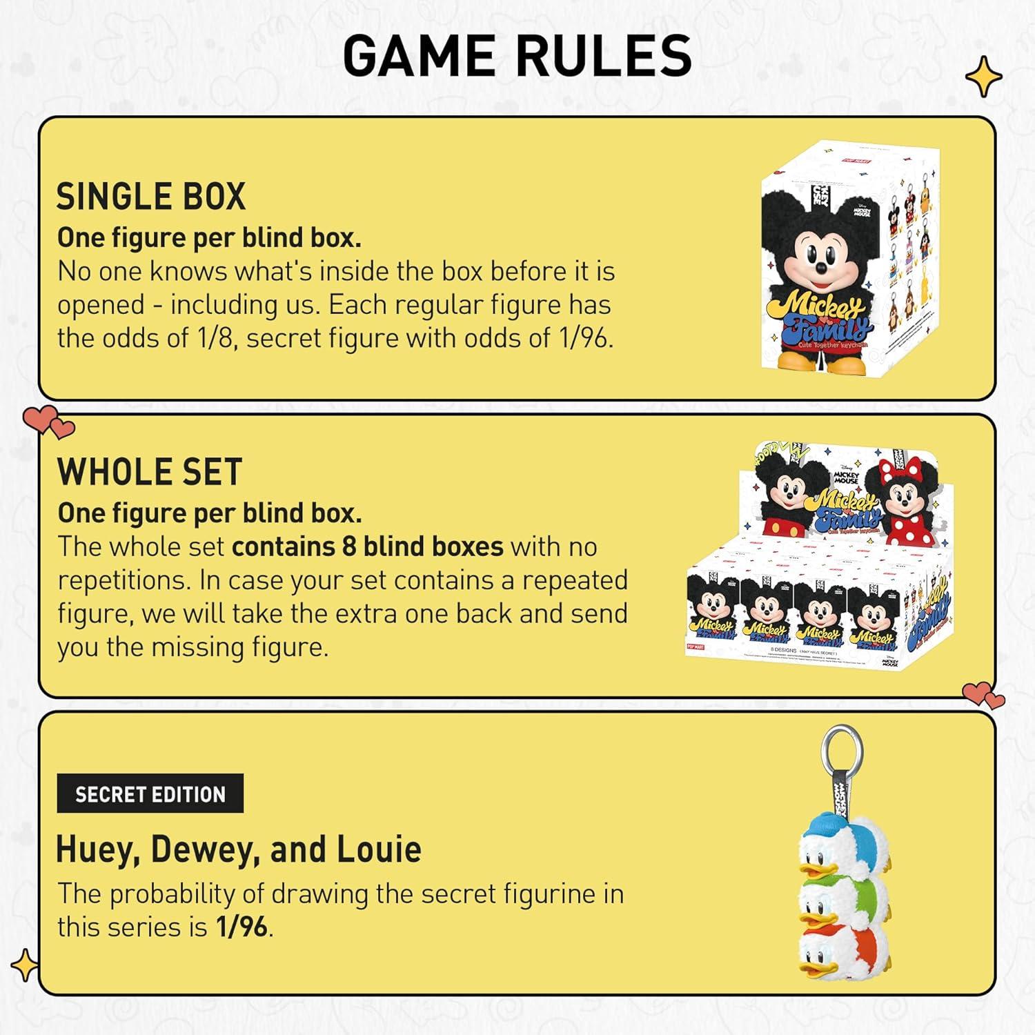 POP MART Mickey Family Cute Together Keychain Series Figures Blind Box: The blind box contains a random figure from a specific series. Each blind box only contains one figure. No one, including us, knows what's inside. This collection contains 8 blind box figures, one of them might be the secret edition.
