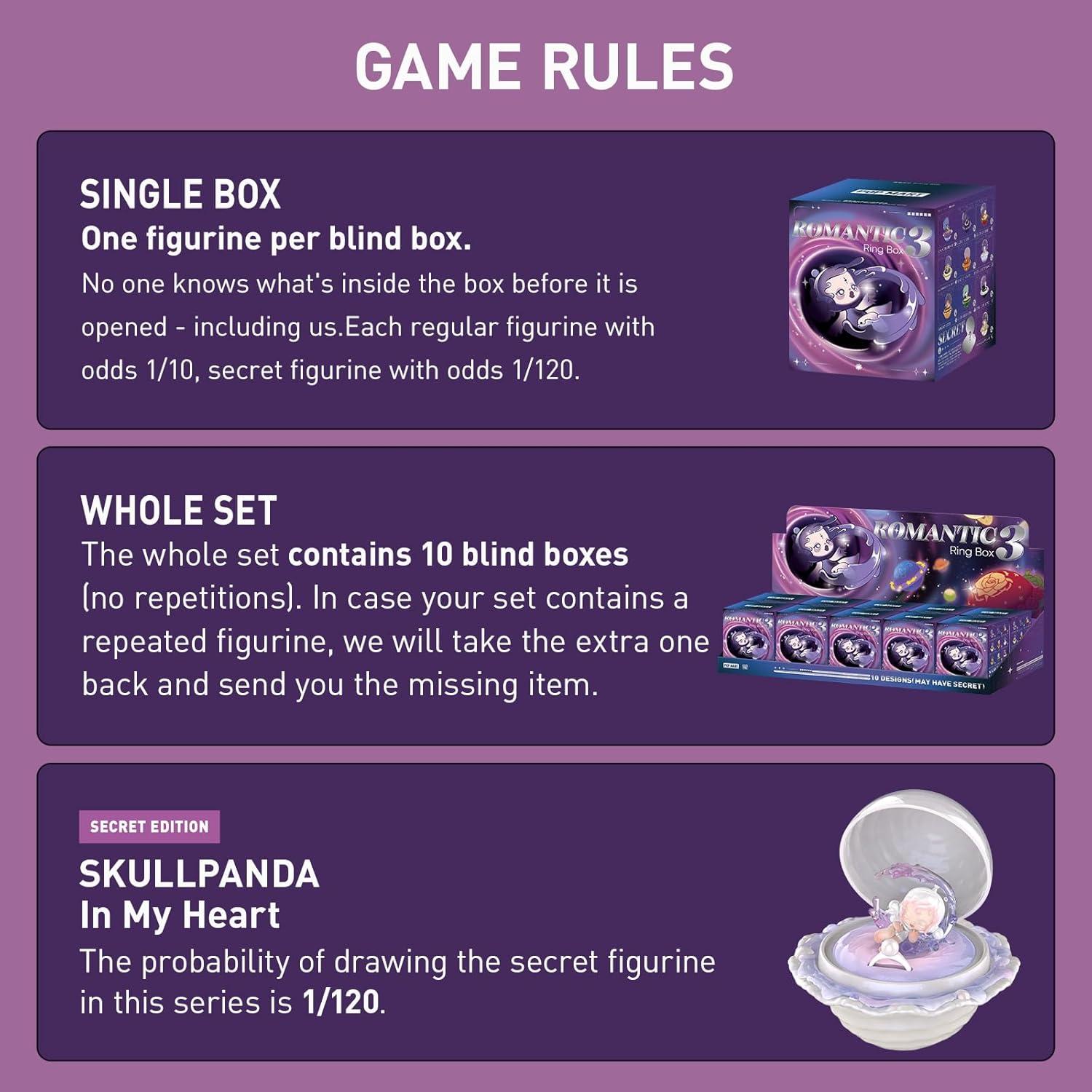 POP MART Romantic Ring Box Series 3 Scene Sets: The blind box contains a random figure from a specific series. Each blind box only contains one figure. No one, including us, knows what's inside. This collection contains 10 blind box figures, one of them might be the secret edition.