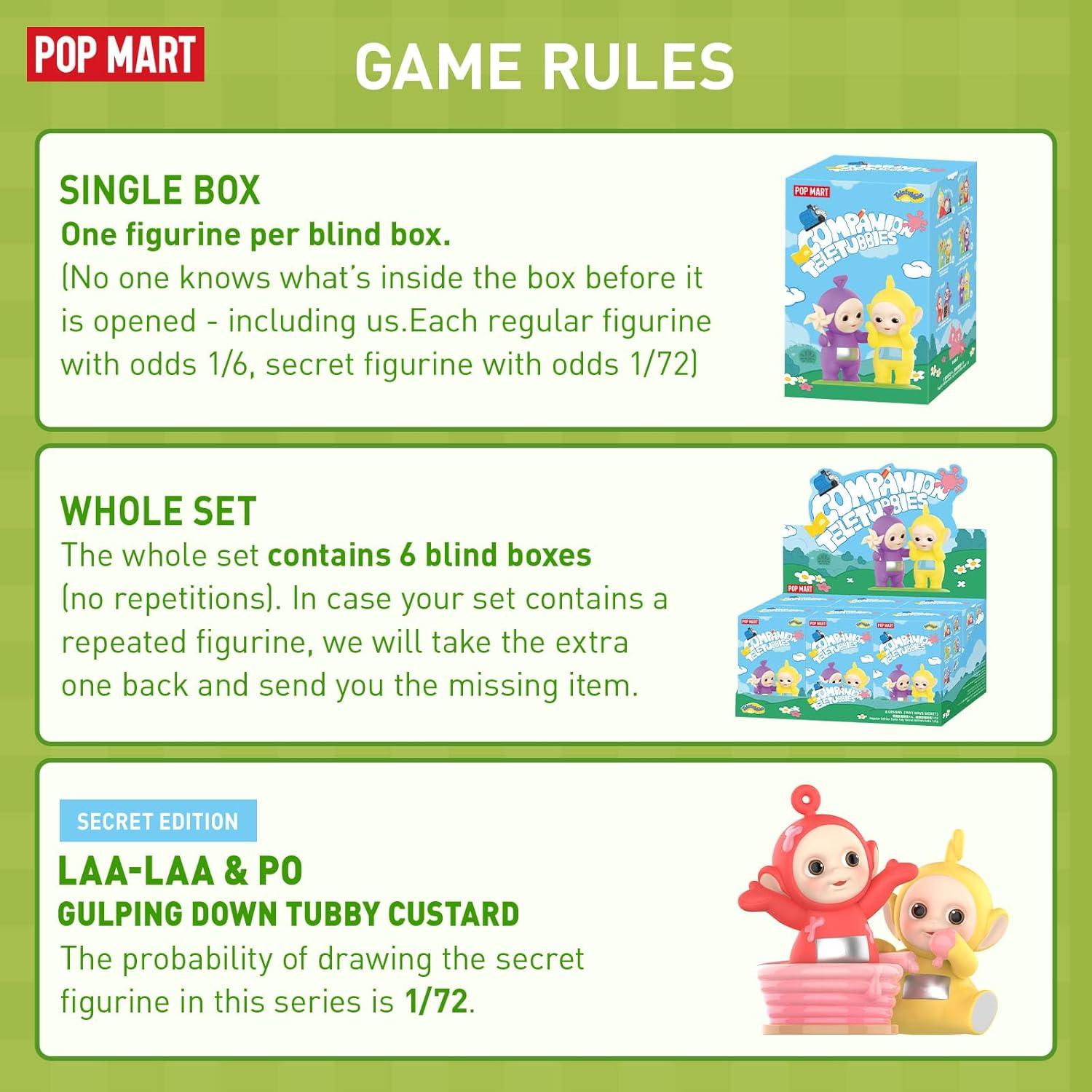 POP MART Teletubbies Companion Series Figures,: The blind box contains a random figure from a specific series. Each blind box only contains one figure. No one, including us, knows what's inside. This collection contains 6 blind box figures, one of them might be the secret edition.