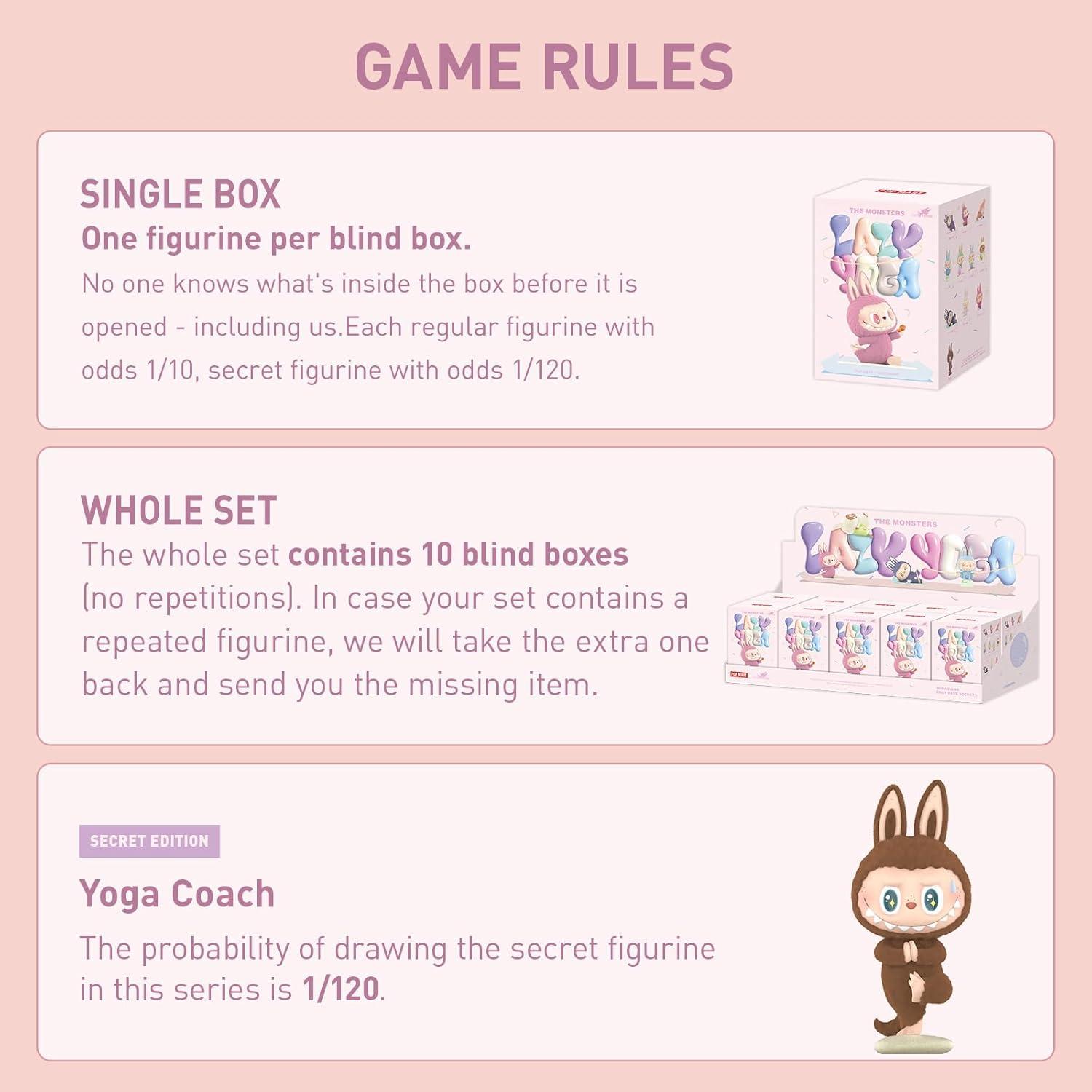POP MART THE MONSTERS Lazy Yoga Series Figures: The blind box contains a random figure from a specific series. Each blind box only contains one figure. No one, including us, knows what's inside. This collection contains 10 blind box figures, one of them might be the secret edition.