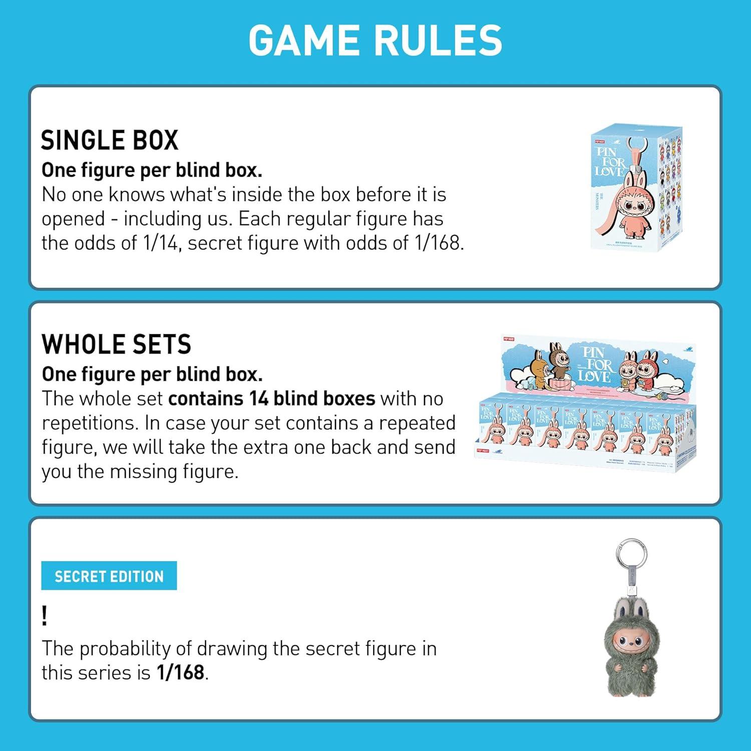 POP MART THE MONSTERS Pin for Love Series-Vinyl Plush Blind Box (N-Z): The blind box contains a random figure from a specific series. Each blind box only contains one figure. No one, including us, knows what's inside. This collection contains 14 blind box figures, one of them might be the secret edition.